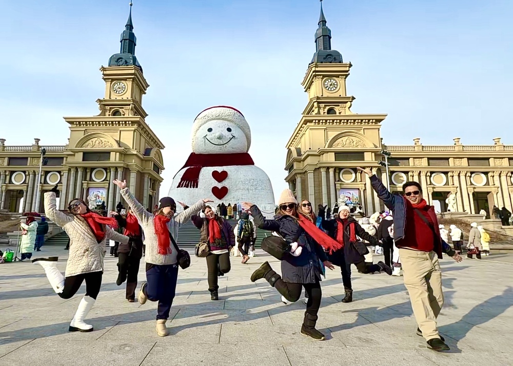 来自菲律宾的游客在哈尔滨网红大雪人前跳舞