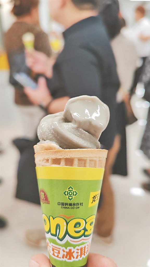 记者一行首先来到产业园19楼的龙王食品公司,刚一进门,就闻到了门口摆放的冰淇淋机传出来的阵阵豆香。据现场工作人员介绍:“这是新推出的一款大豆冰淇淋,作为纯植物蛋白冰淇淋,它不仅保留了传统冰淇淋的口感,还具备了高蛋白、低脂肪、低嘌呤、无胆固醇、无添加剂的特点,适合全龄层人群食用。”