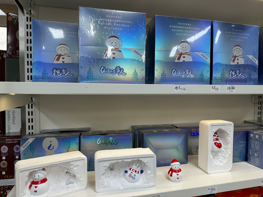 1月26日,哈尔滨群力音乐公园附近一家文创商店销售的“挖雪人”盲盒。新华网 邱虹摄