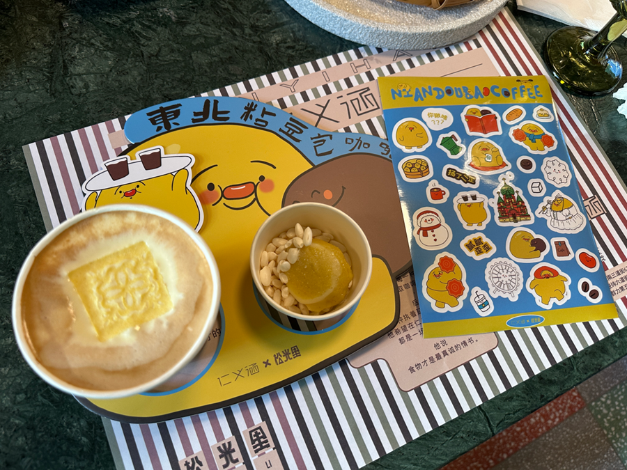 此外,冻梨花茶、冻柿子咖啡等融合创新的特色饮品,在社交平台上被游客广泛分享。位于中华巴洛克历史文化街区的一家餐饮店首创“粘豆包咖啡”,将传统东北美食粘豆包与咖啡结合,并推出粘豆包系列文创商品,受到了消费者的喜爱。
