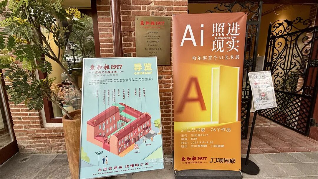 在哈尔滨道里区西十三道街43号的东和昶1917,这座由百年老建筑蜕变而成的宽街文化复合体里,此前因先锋艺术展和孤独症画展而成为“流量担当”的门洞画廊,日前迎来第三场艺术展《AI照进现实》——来自全球21位艺术家的76组AI艺术创作,以充满灵性与想象力的AI世界,让百年砖墙与数字流光相遇,让传统空间与未来感深度交融,为市民与游客开启了一场关于艺术、科技与人类感知的探索之旅。